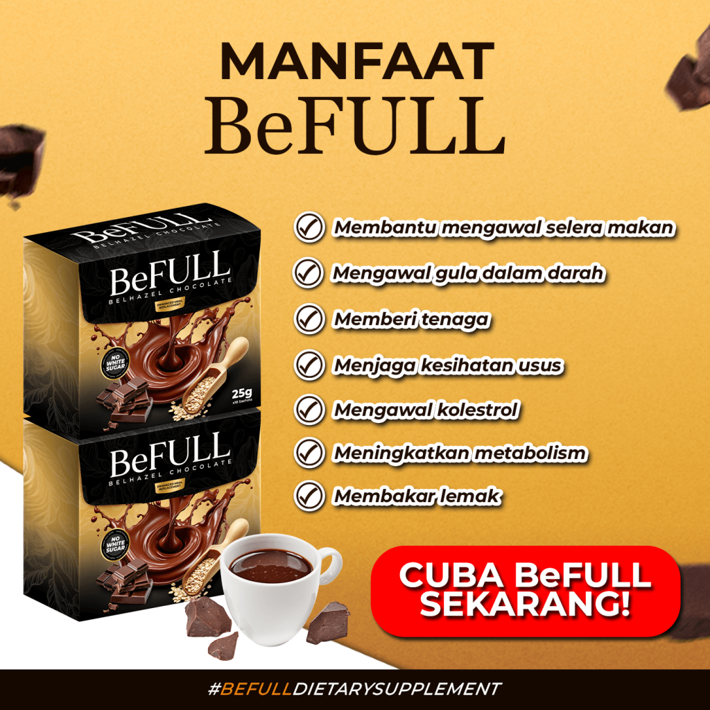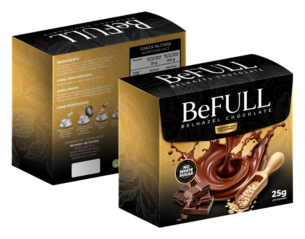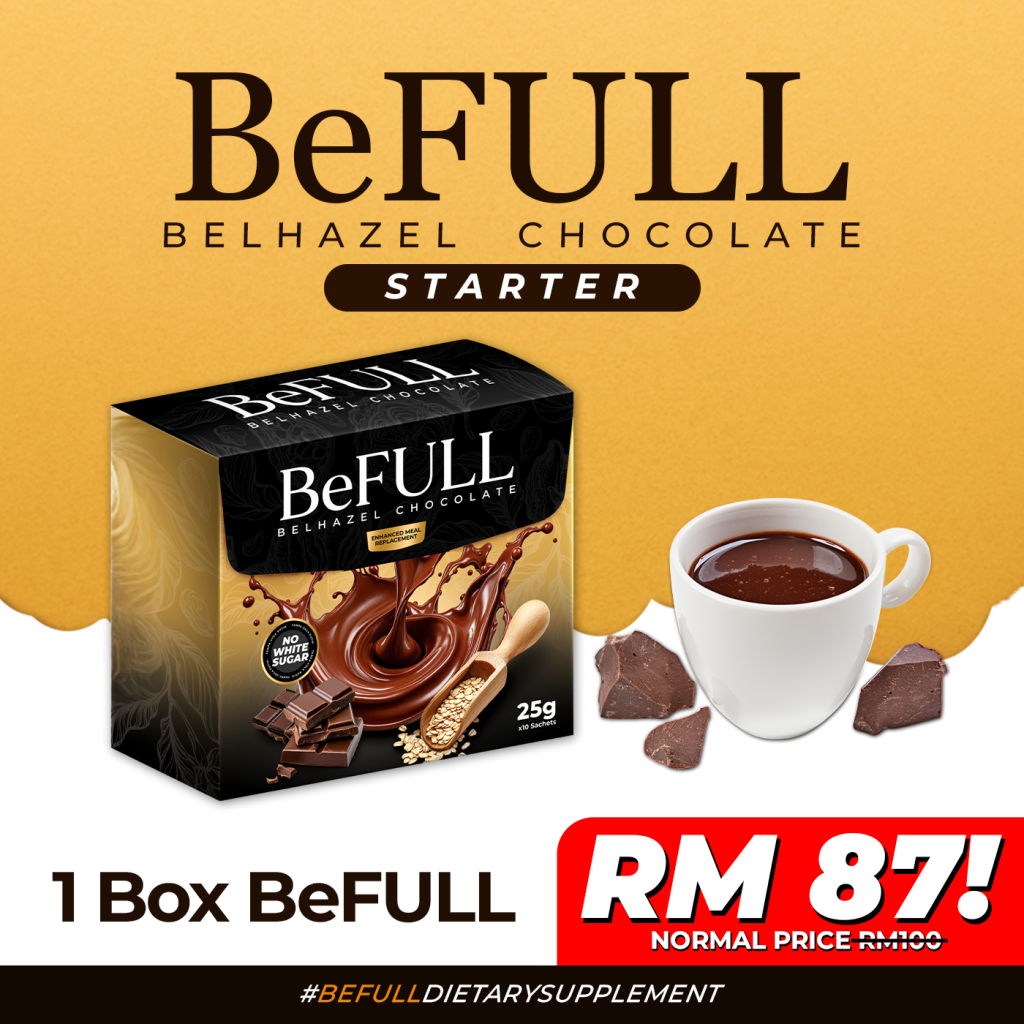 BeFull adalah produk kategori Meal Replacement berperisa Belgian Chocholate & Hazelnut dengan rasa premium yang kaya dengan kandungan oat & makanan tambahan yang dapat membantu ramai di kalangan mereka yang ingin menurunkan/mengawal berat badan ke paras lebih ideal.