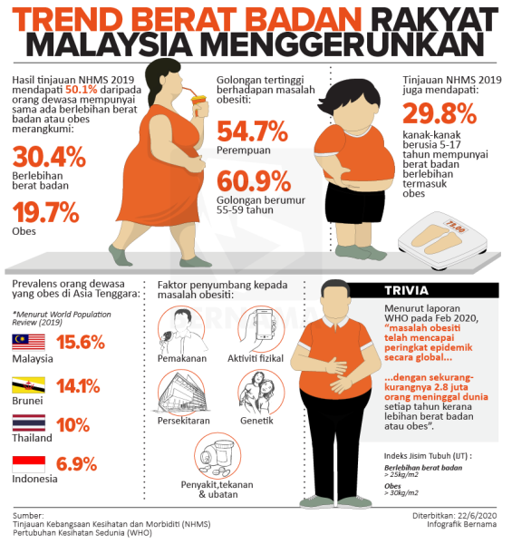 Hasil tinjauan NHMS 2019 mendapati 50.1% daripada orang dewasa mempunyai sama ada berat berlebihan berat badan atau obes merangkumi 30.4% berlebihan berat badan dan 19.7% obes.