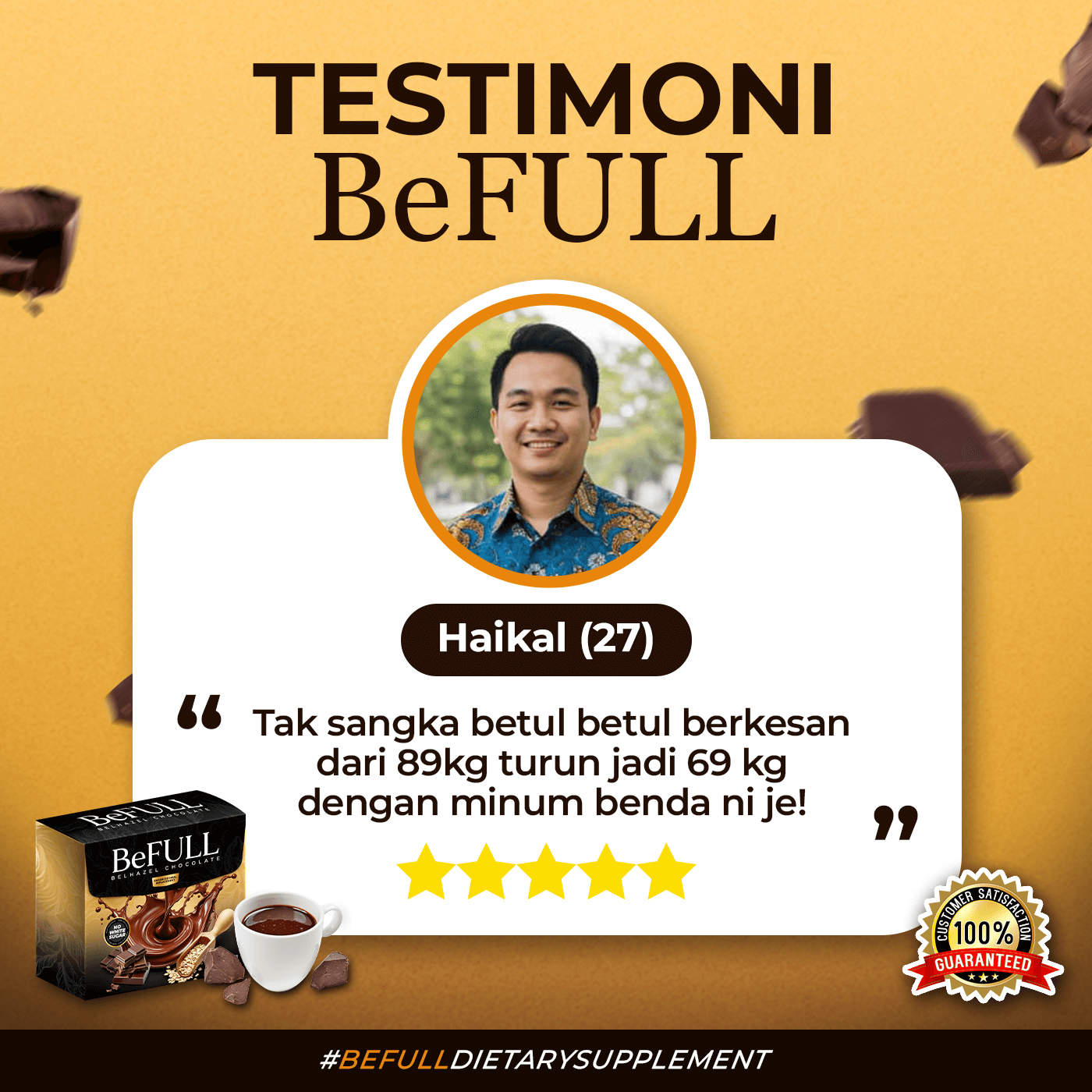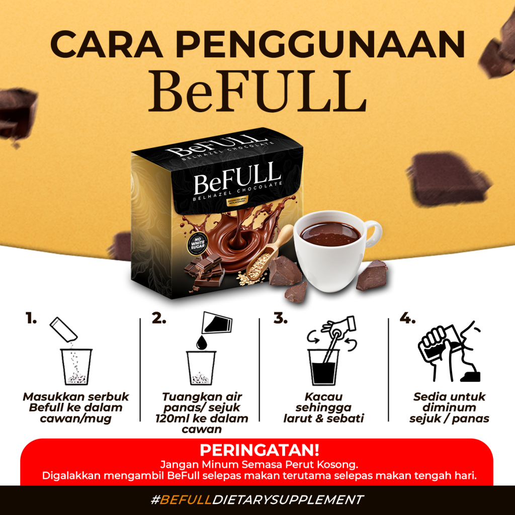 Hanya Amalkan BeFULL Belhazel Chocolate untuk Kesan Yang Optimium Dan MAXIMUM! Diakui Selamat Tanpa Sebarang Kesan Sampingan. Jaminan Wang Dikembalikan PENUH Tanpa Banyak Soal Jika Tidak Berkesan.